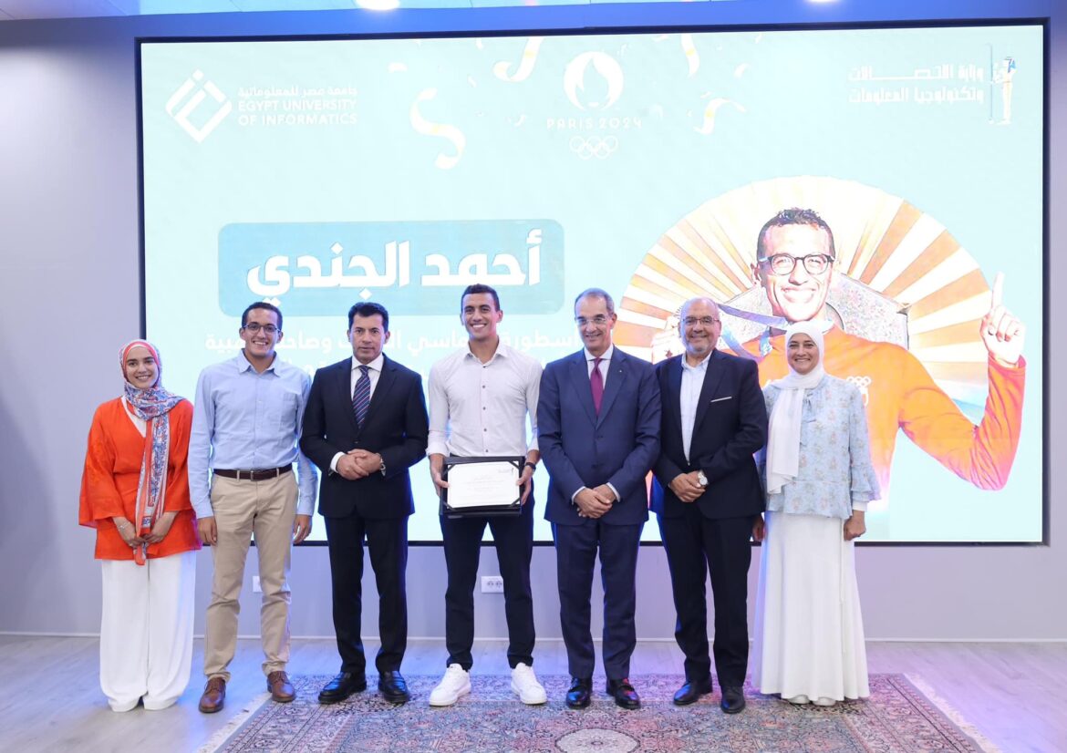 The Minister of Communications and Information Technology Amr Talaat and the Minister of Youth and Sports Ashraf Sobhy have honored students from Egypt University of Informatics (EUI) who won gold medals in world sports championships. Among the students was Olympic champion Ahmed Elgendy, a student at the Faculty of Business Informatics who not only secured a gold medal at Paris 2024 Olympics but also set a world record of 1,555 points.