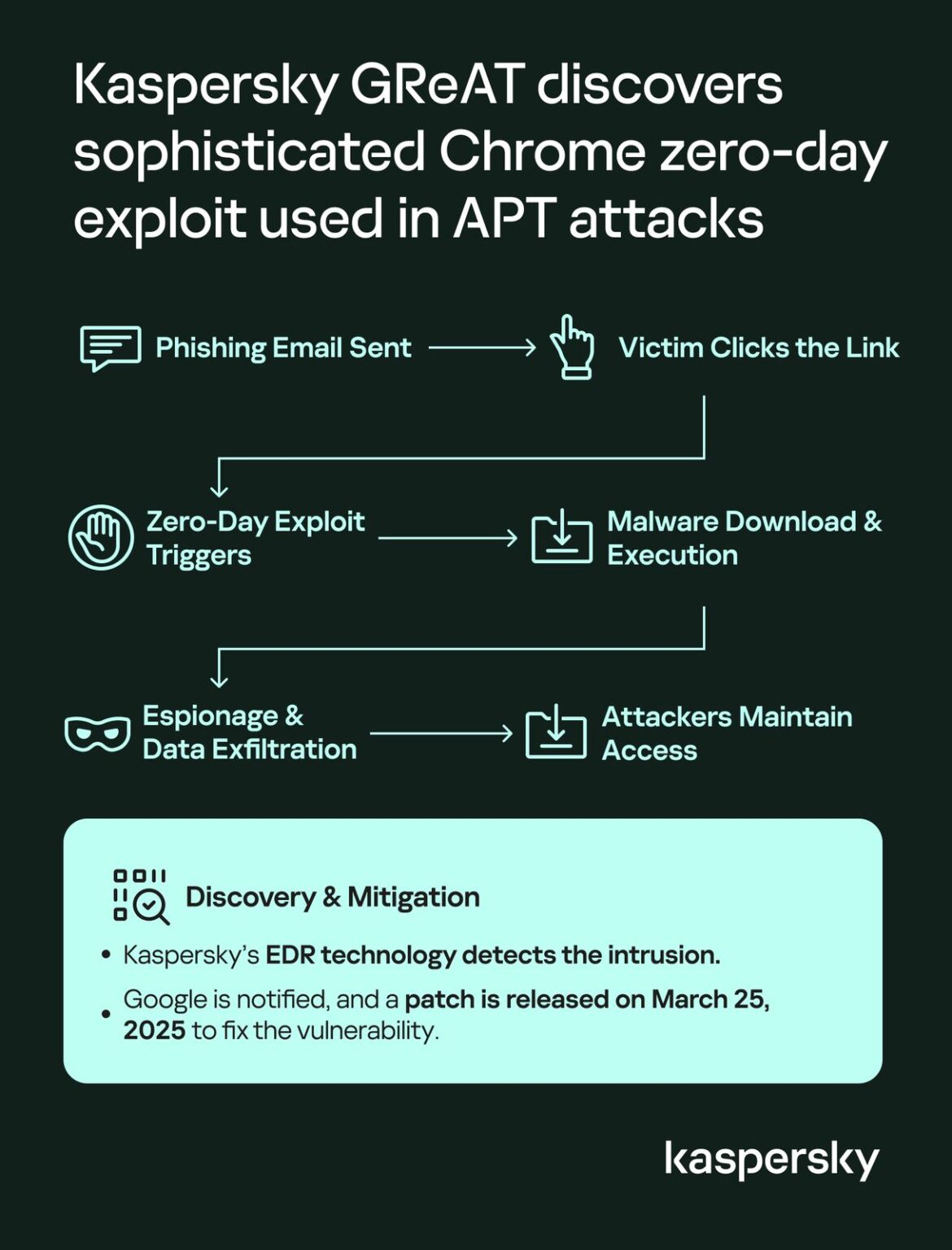 In mid-March 2025, Kaspersky detected a wave of infections triggered when users clicked personalized phishing links delivered via email. After clicking, no additional action was needed to compromise their systems. Once Kaspersky’s analysis confirmed that the exploit leveraged a previously unknown vulnerability in the latest version of Google Chrome, Kaspersky swiftly alerted Google’s security team.
