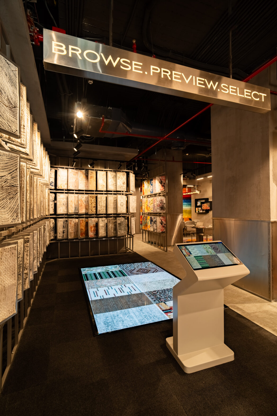 Using full-scale projection, the Phygital Preview allows them to visualize designs directly on the store floor and explore wall-mounted sampling sections that showcase the look and feel of each rug before finalizing their choices.